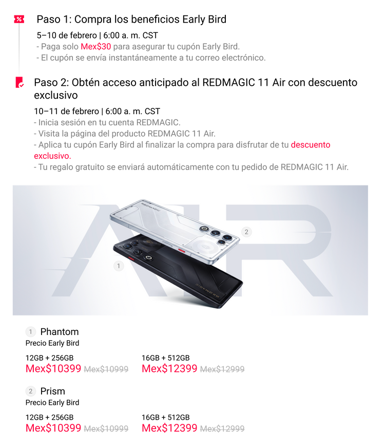 1) Del 10 al 11 de febrero, a las 6 AM CST, solo los usuarios Early Bird pueden solicitar el REDMAGIC 11 Air. Los usuarios regulares pueden realizar sus pedidos a partir del 11 de febrero a las 6 AM CST.