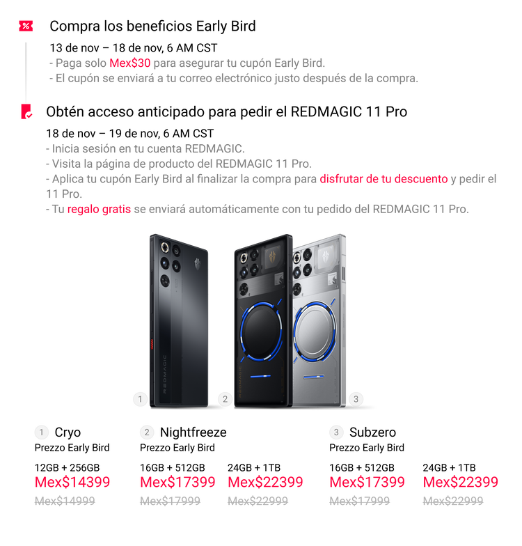 1) Del 18 al 19 de noviembre, 6 AM CST, solo los usuarios Early Bird pueden pedir el REDMAGIC 11 Pro. Los usuarios regulares podrán pedirlo a partir del 19 de noviembre, 6 AM CST.