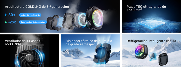 - Refrigeración de alta potencia de 36W: Enfría dispositivos hasta los -25°C para un rendimiento "congelado".