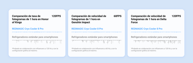 *Datos de REDMAGIC Labs. Probado a una temperatura ambiente de 25 °C, con el disipador suspendido y el modo Destructor activado. La temperatura de la superficie se midió hasta -25 °C.