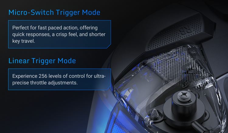 Cambia sin problemas entre los gatillos de micro-interruptor y lineales para adaptarte a cualquier género de juego, desde FPS hasta carreras.