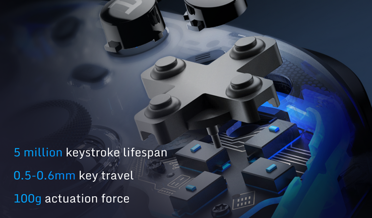 Experimenta una precisión mejorada respaldada por algoritmos avanzados y detección electromagnética, proporcionada por el joystick personalizado con efecto Hall y el duradero anillo resistente al desgaste de POM.